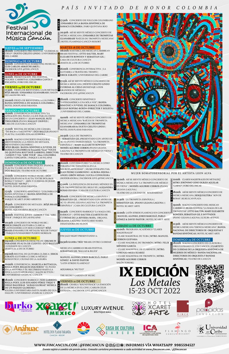 Este años 2022 el FIM Cancún renace con resiliencia, teniendo como país invitado de honor a Colombia, razón por la que sobresaldrá la participación de músicos de esa nacionalidad, de entre otras muchas representadas por extraordinarios intérpretes que ofrecen su arte ante un espectro multicultural, que se hace evidente y brinda identidad a Cancún y a todo el caribe mexicano; sitios en los que a lo largo de nueve días se escuchará música clásica, barroca, pop, tango, jazz y mucho más, la fiesta iniciará con banda sinfónica.